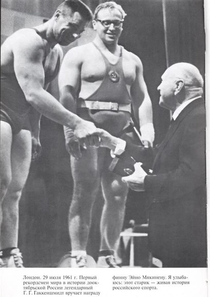 Лондон, 1961 год. Юрий Власов, наш самый знаменитый штангист-чемпион вспоминает: Я наклонился с пьедестала почёта, почти присел, — но не потому, что мне было неловко пожать протянутую руку. Я хотел ближе увидеть лицо старика, старался удержать в памяти каждое его слово. Неужели это возможно: Лондон, мировой рекорд, "Скала-театр", — и мне вручает медаль сам Георг Гаккеншмидт? Я не сводил с него глаз и тогда, когда он поздравлял второго и третьего призёров соревнований в тяжёлом весе — финна Эйно Мякинена и американца Дика Зэрка.