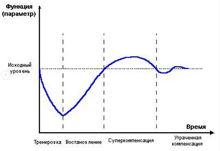 Есть такое понятие, как СУПЕРКОМПЕНСАЦИЯ. Инстаграм подчеркнул мне сейчас это слово красным, потому что инстаграм не знает, как правильно тренироваться. А я знаю! Суперкомпенсация - послетренировочный период, в течение которого тренируемая функция/параметр имеет более высокий показатель по сравнению с исходным уровнем. Чтобы было более понятно, смотри вторую картинку и читай дальше. Согласно научным данным, имеется три основных фазы восстановления после тренинга: 1️. первая фаза - фаза восстановления, во время которой происходит репарация ткани, в течение этого периода функция восстанавливается до исходного уровня. 2️. вторая фаза - суперкомпенсация, во время которой наблюдается повышенная работоспособность, которая может превысить исходный уровень на 10 - 20%. 3️⃣третья фаза - фаза постепенного возвращения к исходному уровню работоспособности.