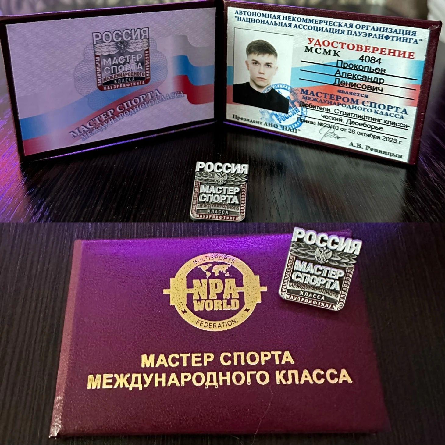 2023 год (28-29 октября): Триумфально выступил на Кубке Сибири «Живая Сталь», завоевав Золото. На этом турнире он выполнил норматив Мастера Спорта Международного класса и установил Рекорд Мира, России, Европы и Азии в федерации НАП в весовой категории 67 кг.
