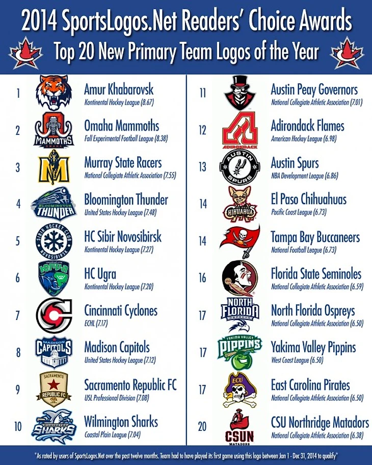Три новых логотипа клубов КХЛ, разработанные в 2014 году, вошли в список лучших новых логотипов года по версии читателей авторитетного тематического сайта Sportslogos.net.