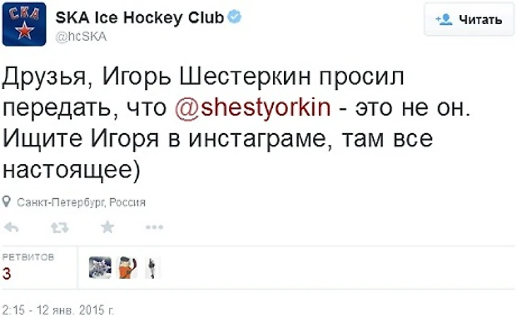 Вратарь СКА Игорь Шестеркин сообщил, что не имеет аккаунта в твиттере.