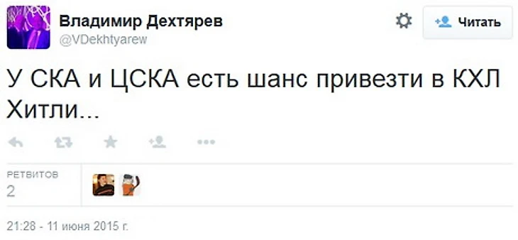 «У СКА и ЦСКА есть шанс привезти в КХЛ Хитли», – написал Дехтярев в своем твиттере.