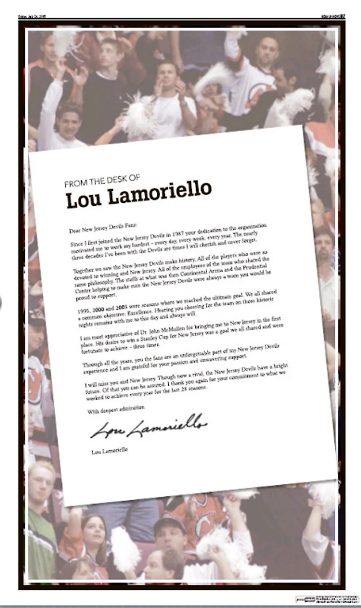 НХЛ. Ламорелло выкупил страницу в газете, чтобы попрощаться с болельщиками «Нью-Джерси»