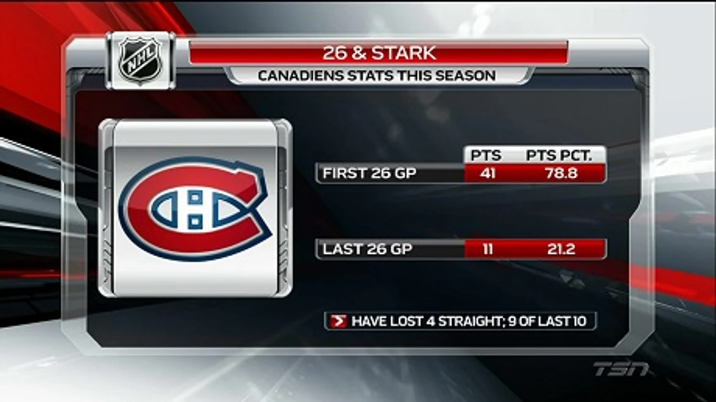 Таким образом, в текущем регулярном чемпионате НХЛ «Канадиенс» проиграли 4-й матч подряд и 21-й в последних 26 встречах.