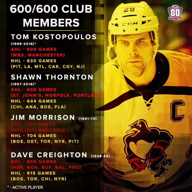АХЛ. Капитан «Уилкс-Бэрри» Костопулос стал четвертым игроком в истории, кто сыграл по 600 матчей в НХЛ и в АХЛ
