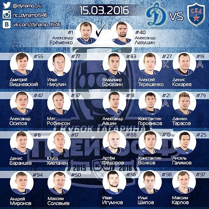 Стал известен состав московского «Динамо» на четвертый матч серии второго раунда Кубка Гагарина против СКА.