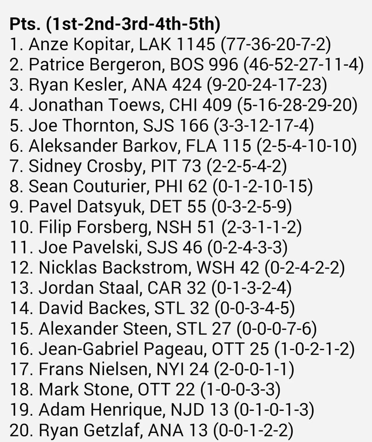 Напомним, что победителем стал новый капитан «Лос-Анджелеса» Анже Копитар, набравший 1145 очков.