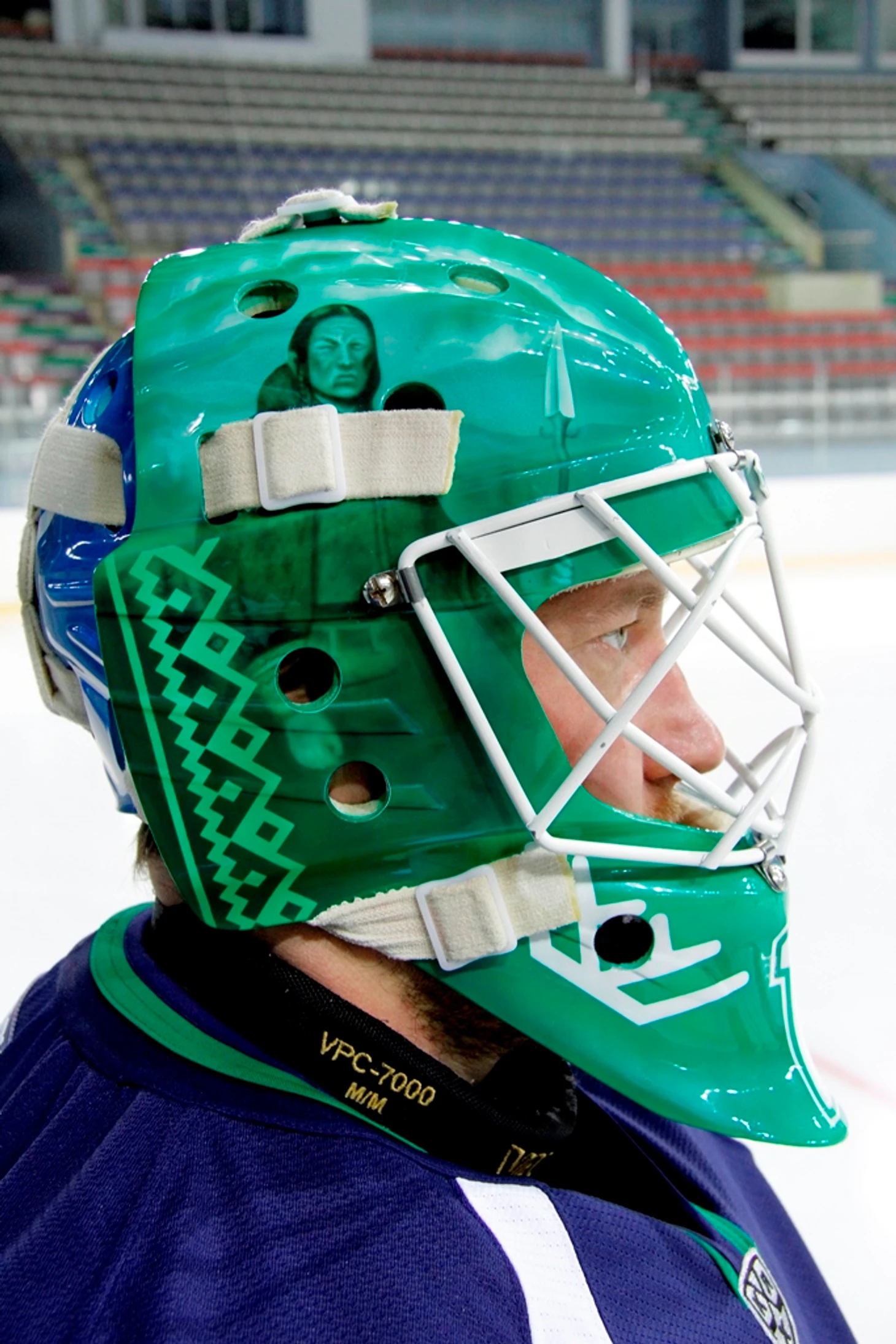 Голкипер «Югры» Фокин представил новый шлем с изображением мамонта и местного аборигена