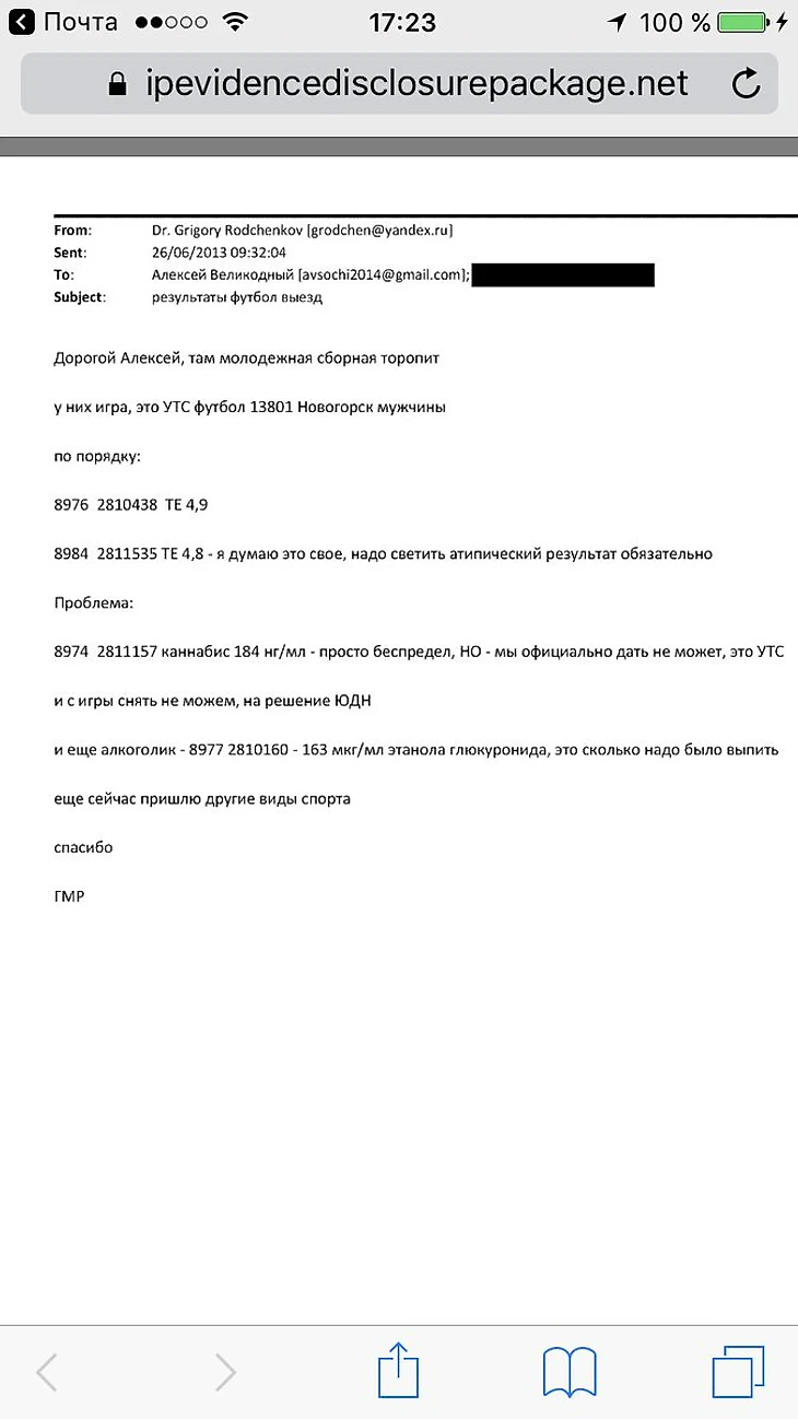 Глава независимой комиссии Всемирного антидопингового агентства (WADA) Ричард Макларен обнародовал письма бывшего директор антидопинговой лаборатории в Москве Григорий Родченков.