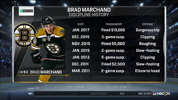Нападающий «Бостона» Брэд Маршанд дисквалифицирован на два матча за колющий удар защитника «Тампы» Джейка Дотчина.