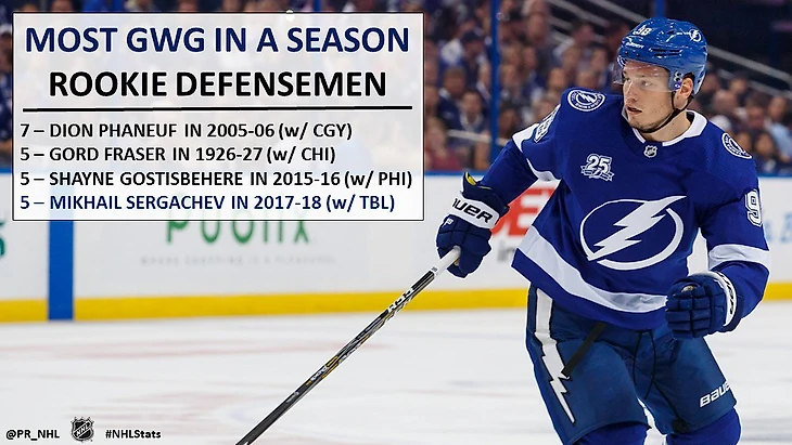 Ранее среди новичков-защитников 5 победных голов забивали только 4 игрока – Дион Фанюф («Калгари», 2005/06, всего 7 голов), Горд Фрэйзер (1926/27, «Чикаго», 5) и Шейн Гостисбеер (2015/16, «Филадельфия», 5).