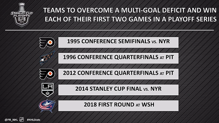 Случай «Коламбуса» стал 5-м в истории НХЛ, когда команда одерживала волевые победы в двух первых матчах серий, уступая по их ходу в 2 или более шайбы.