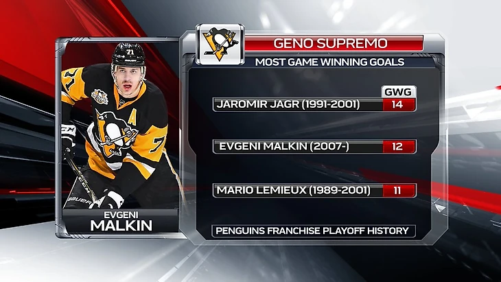 Забив победный гол в ворота «Вашингтона» (3:1) в четвертом матче серии второго раунда Кубка Стэнли (2-2), Евгений Малкин вышел на 2-е место по таким голам в истории «Питтсбурга» в Кубке Стэнли.