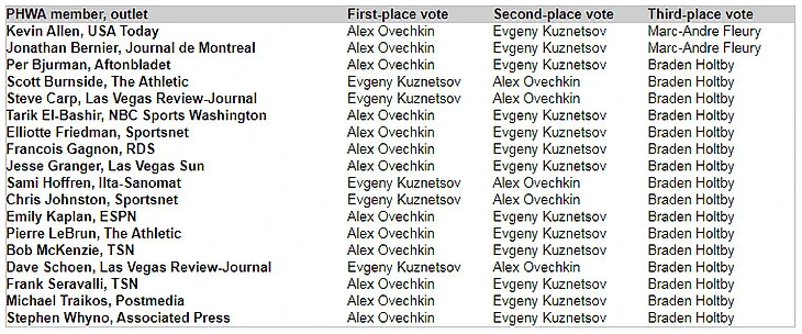 Напомним, что из 18 журналистов 13 отдали первое место капитану «Вашингтона» Александру Овечкину и пятеро поставили его на второе место. Его одноклубник Евгений Кузнецов получил пять первых мест и тринадцать вторых.