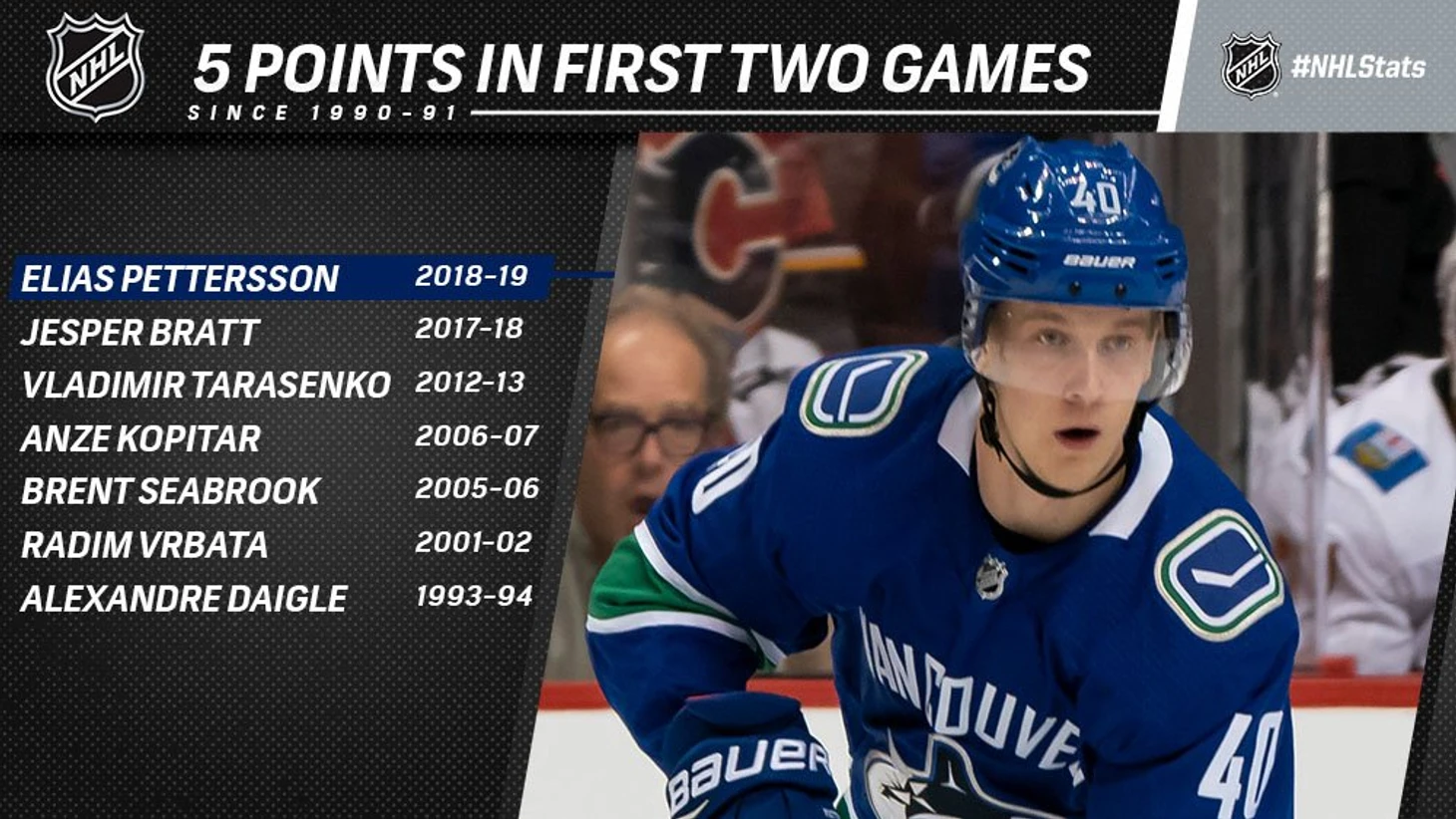 НХЛ. Элиас Петтерссон – 7-й новичок за 28 лет, набравший 5 очков в двух первых матчах