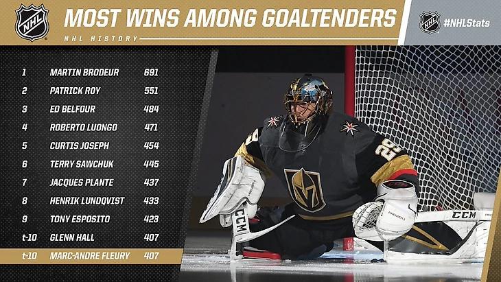 Победа стала для него 407-й в карьере, и Флери разделил 10-е место в истории лиги по их количеству с Гленом Холлом.