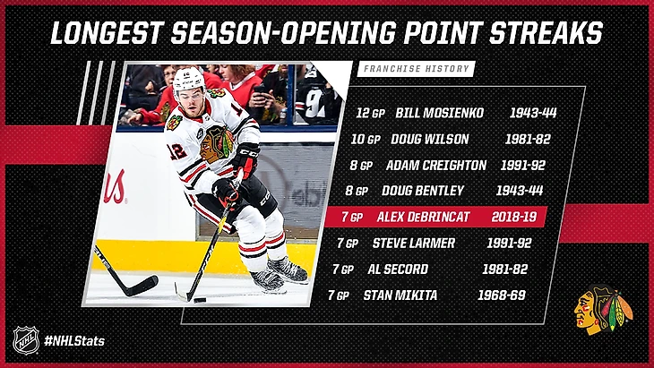 При этом только 4 игрока в истории «Блэкхокс» имели более продолжительную результативную серию на старте.