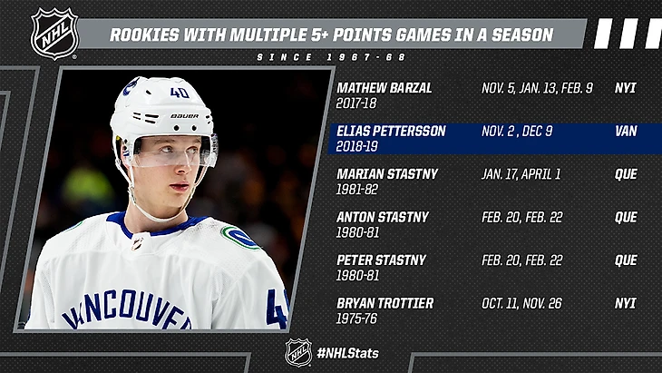 Форвард «Ванкувера» Элиас Петтерссон набрал 5 (1+4) очков в матче с «Сент-Луисом» (6:1) и был признан второй звездой.