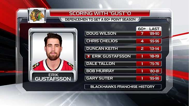 НХЛ. Густафссон – 7-й защитник в истории «Чикаго», набравший 60 очков за сезон