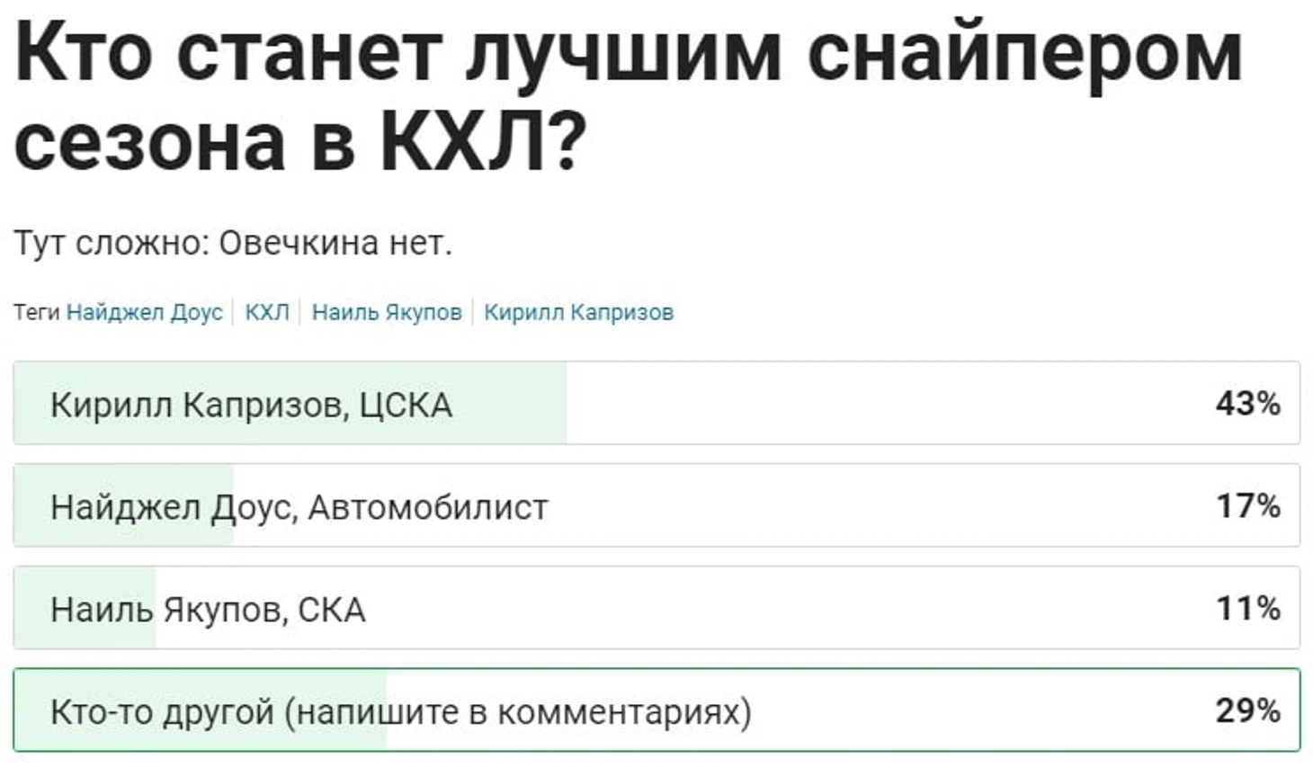 43% участников опроса отдали голоса за победителя снайперской гонки минувшего сезона – форварда ЦСКА Кирилла Капризова.