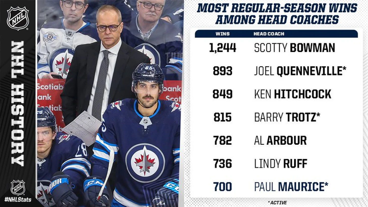 Главный тренер «Джетс» Пол Морис одержал 700-ю победу в регулярных чемпионатах НХЛ.