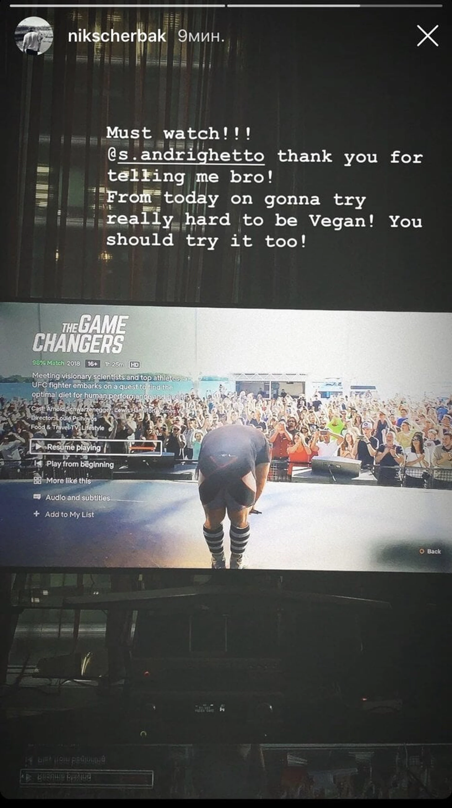 «Смотреть обязательно. С сегодняшнего дня буду очень стараться быть веганом. Вы тоже должны попробовать», – написал Щербак в инстаграме.