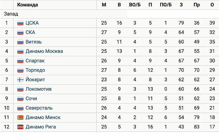 В Западной конференции на первом месте расположился ЦСКА, у которого также 39 очков. У армейцев 16 побед в основное время, у «Ак Барса» – 18.