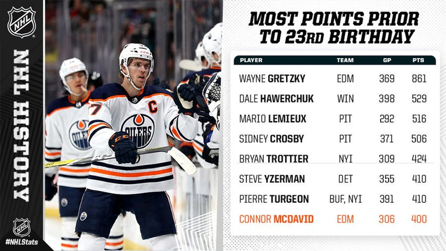 Макдэвид – 8-й игрок в истории НХЛ, набравший 400 очков до 23 лет