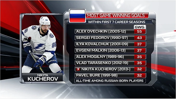 Кучеров превзошел достижение Алексея Яшина (491 балл) и вышел на 7-е место среди российских игроков по очкам, набранным за первые семь сезонов в НХЛ.