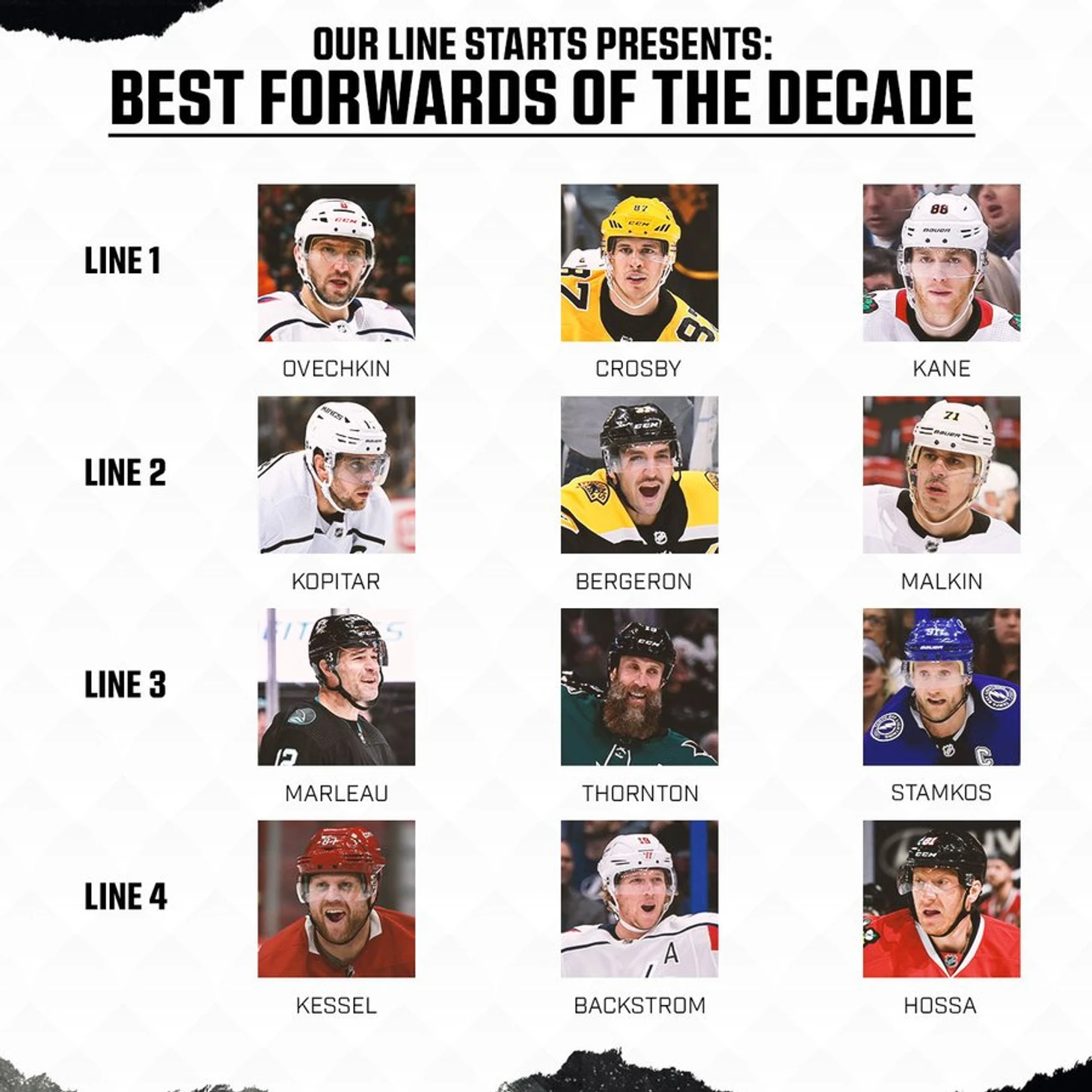 Капитан «Вашингтона» Александр Овечкин попал в первое звено команды десятилетия. В тройку также вошли форвард «Питтсбурга» Сидни Кросби и нападающий «Чикаго» Патрик Кэйн.