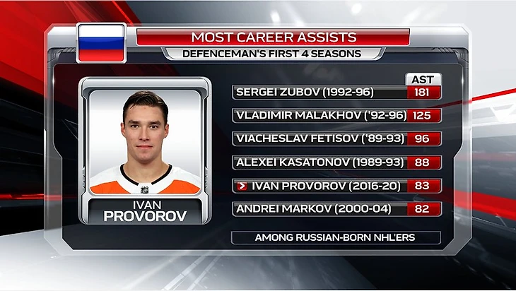Проворов превзошел достижение Андрея Маркова (82 ассиста) и вышел на 5-е место среди российских защитников по передачам, сделанным за первые четыре сезона в НХЛ.