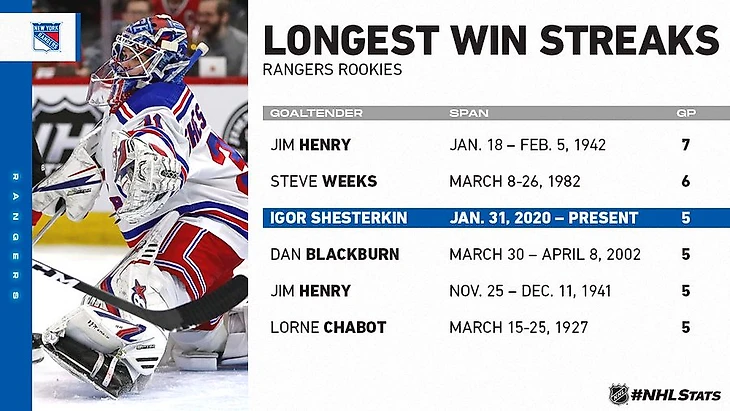 Шестеркин – 5-й вратарь-новичок в истории «Рейнджерс» с 5-матчевой победной серией