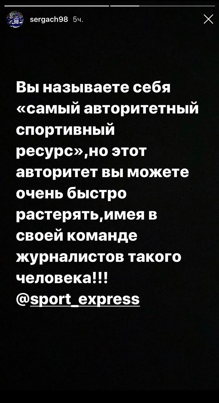 Вы называете себя «самый авторитетный спортивный ресурс», но этот авторитет вы можете очень быстро растерять, имея в своей команде журналистов такого человека!» – говорится в записи Сергачева в сторис инстаграма.
