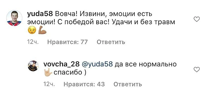 «Вовча! Извини, эмоции есть эмоции! С победой вас! Удачи и без травм», – написал защитник «Ак Барса».