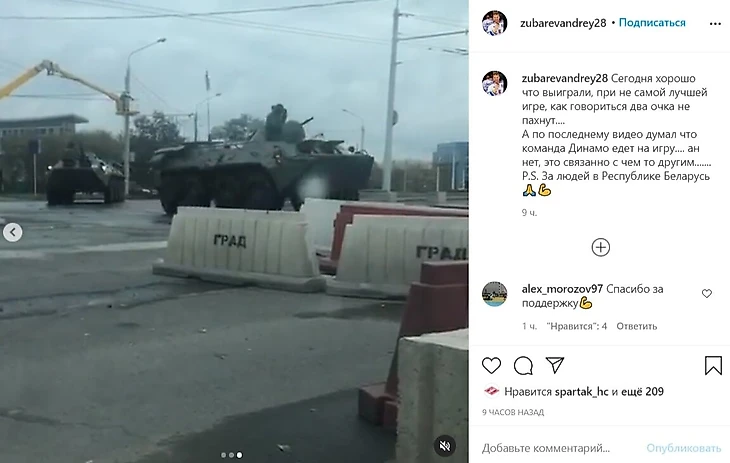 • Защитник «Спартака» Зубарев о видео с БТР в Минске: «Думал, что «Динамо» едет на игру. За людей в Беларуси»