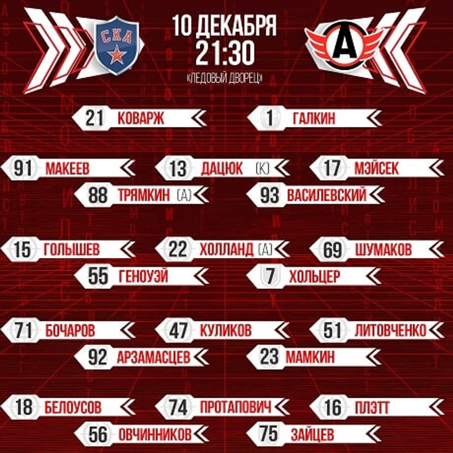 В заявку попал новичок команды Сергей Шумаков. Он будет играть в тройке с Анатолием Голышевым и Питером Холландом.