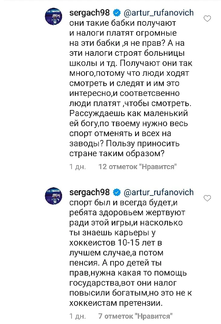 А про детей ты прав, нужна какая-то помощь [от] государства, вот они налог повысили богатым, но это не к хоккеистам претензии», – ответил Сергачев.