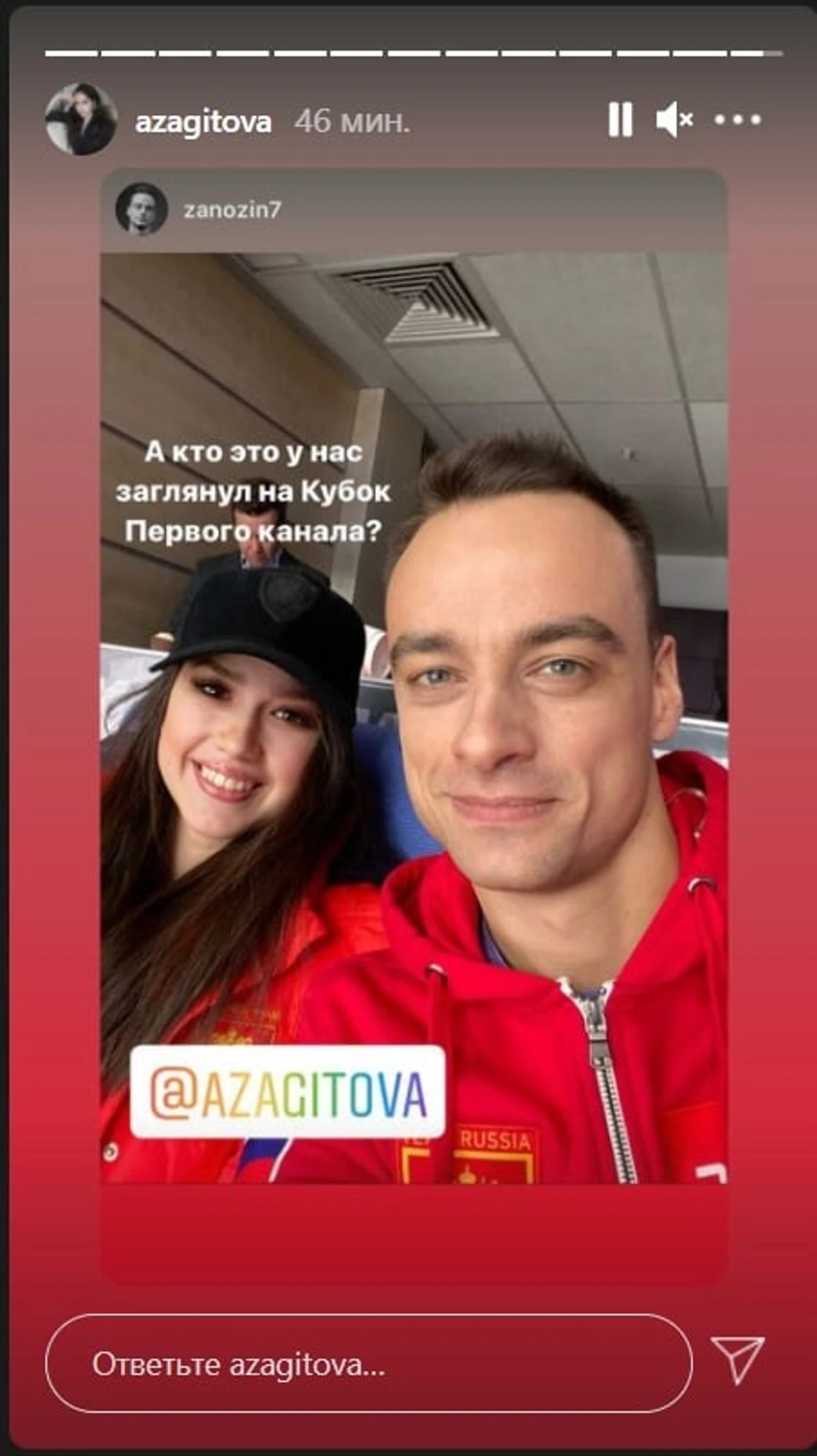 Загитова также сделала репост фотографии с комментатором Павлом Занозиным.