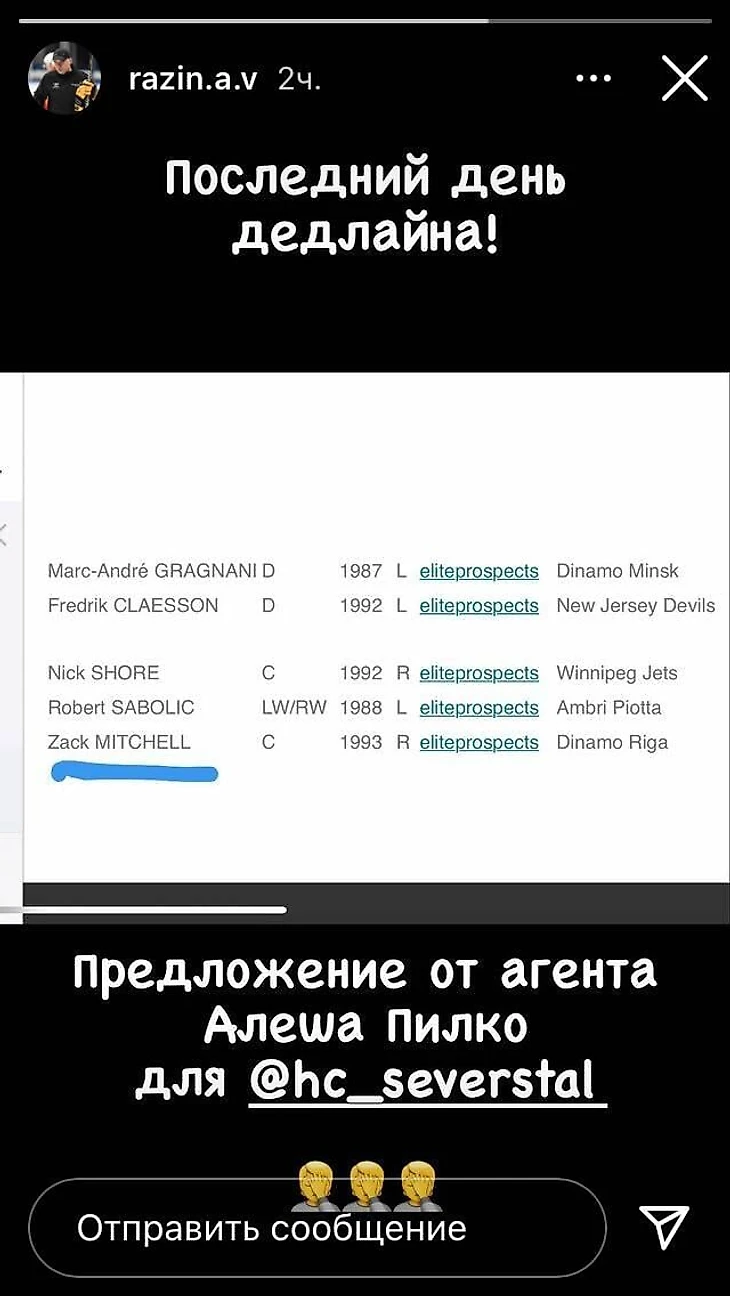 «Последний день дедлайна! Предложения агента Алеша Пилко для «Северстали». 🤦♂️🤦♂️🤦♂️», – написал Разин.