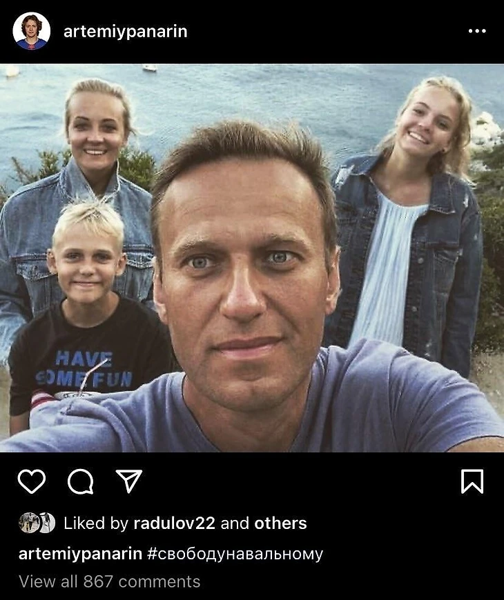 В инстаграме Панарин опубликовал фотографию политика Алексея Навального с семьей и поставил хэштэг #свободунавальному.