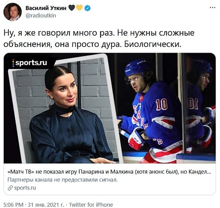Журналист Василий Уткин прокомментировал высказывания генерального продюсера «Матч ТВ» Тины Канделаки о несостоявшемся показе матча регулярного чемпионата НХЛ между «Питтсбургом» и «Рейнджерс» (5:4 ОТ).