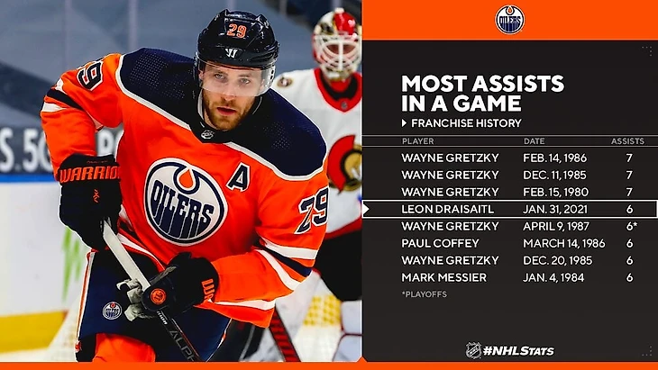 Кроме того, Драйзайтль стал четвертым игроком в истории «Эдмонтона», сделавшим не менее 6 передач за матч.