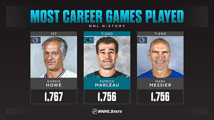 Форвард «Сан-Хосе» Патрик Марло провел 1756-й матч в регулярных чемпионатах НХЛ, выйдя на лед в игре с «Аризоной» (0:4).