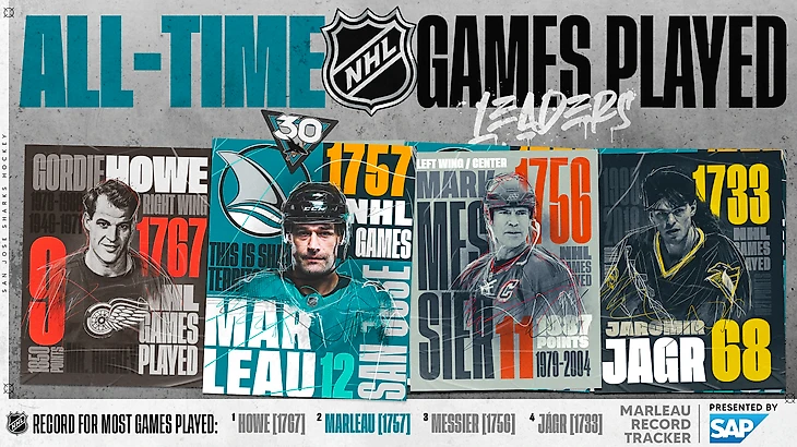 Форвард «Сан-Хосе» Патрик Марло провел 1757-й матч в регулярных чемпионатах НХЛ, выйдя на лед в игре с «Миннесотой» (4:3 Б).