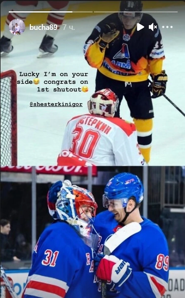 Нападающий опубликовал в сторис инстаграма фотографии с Шестеркиным с матча Париматч Молодежной хоккейной лиги между «Спартаком» и «Алмазом», а также с игры «Рейнджерс».