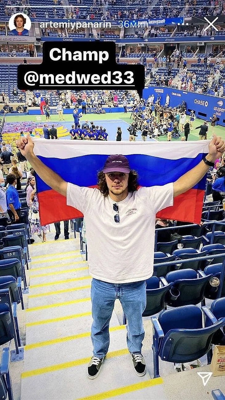 Хоккеист опубликовал сторис с арены. На второй фотографии он держал в руках российский флаг, Панарин отметил профиль Медведева и написал: «Champ».