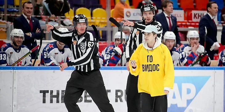 Он произошел в конце третьего периода. После драки между игроками команд на лед выбежал блогер в желтом свитере с надписью «Го видос».