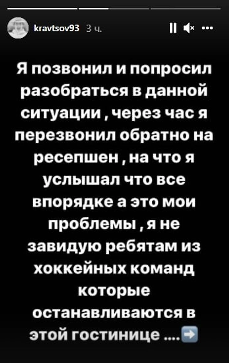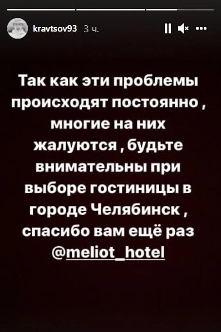 Нападающий системы «Рейнджерс» Виталий Кравцов опубликовал несколько сторис в инстаграме о качестве 4-звездочного отеля «Мелиот» в Челябинске.
