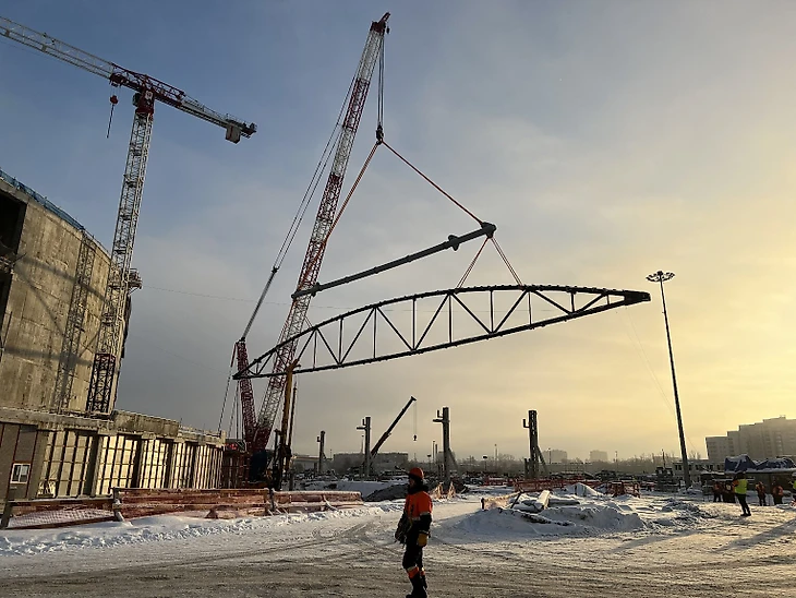 Первую металлическую ферму основного купола кровли нового ледового дворца подняли на высоту 35 метров.