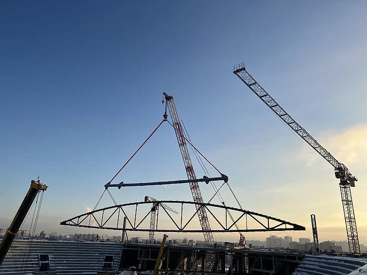 Вес конструкции составляет 140 тонн, а пролет – 113,5 метра. Это первая из 20 запланированных ферм, которые будут являться несущей системой кровли стадиона.